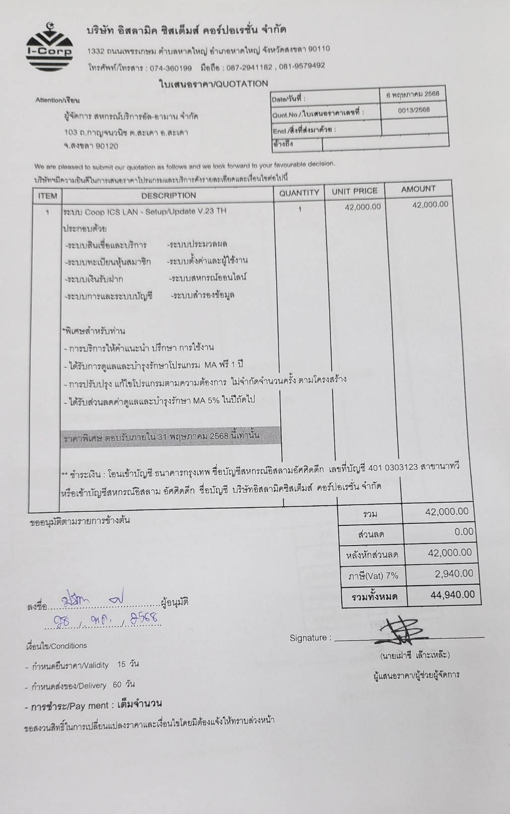 QT250071ชำระเต็มชุมนุมสหกรณ์อิสลามแห่งประเทศไทย จำกัดติดตั้งโปรแกรมระบบบริหารงานสหกรณ์อิสลาม (ใหม่)1,926.00ลูกค้าตอบรับ