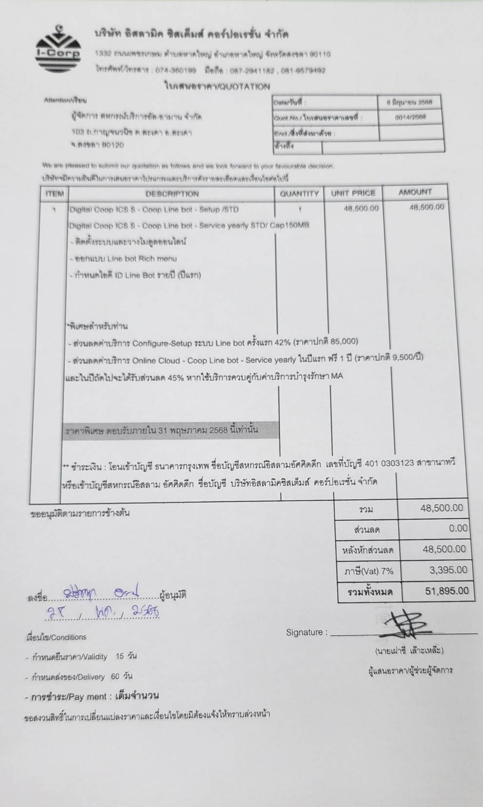 QT250079ชำระเต็มกลุ่มกองทุนสวัสดิการบัยตุลมาล(บริษัท ยู เอส คอนส์ เทค จำกัด)Digital Coop ICS S - Coop Line bot - Service yearl...91,271.00รอการอนุมัติ