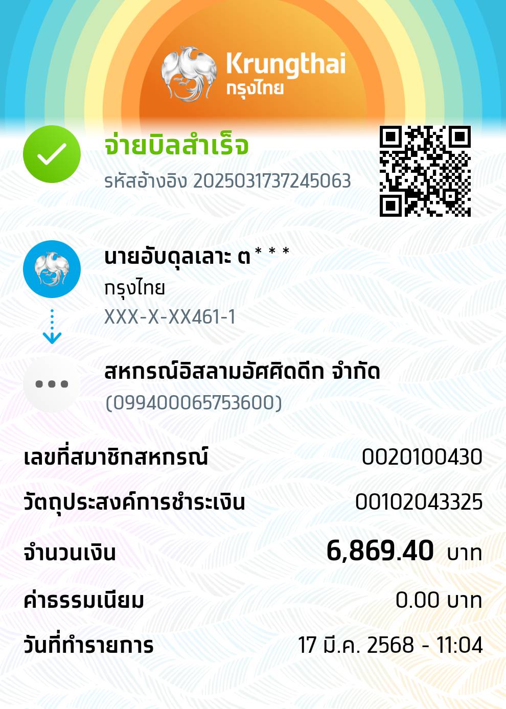 Paid BY : โอนผ่านบัญชี สหกรณ์อิสลามอัศศิดดีก จำกัด