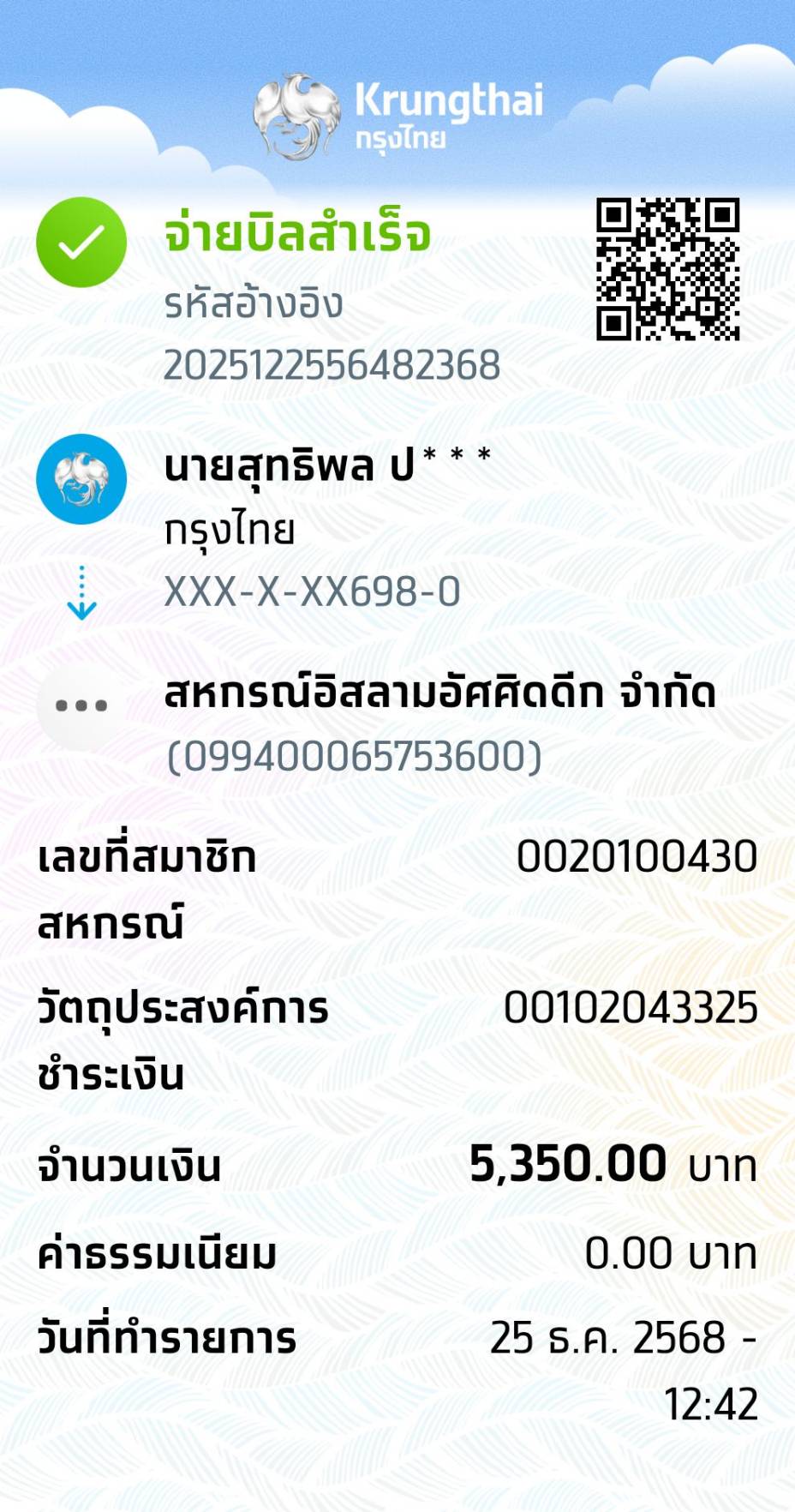 Paid BY : โอนผ่านบัญชี สหกรณ์อิสลามอัศศิดดีก จำกัด